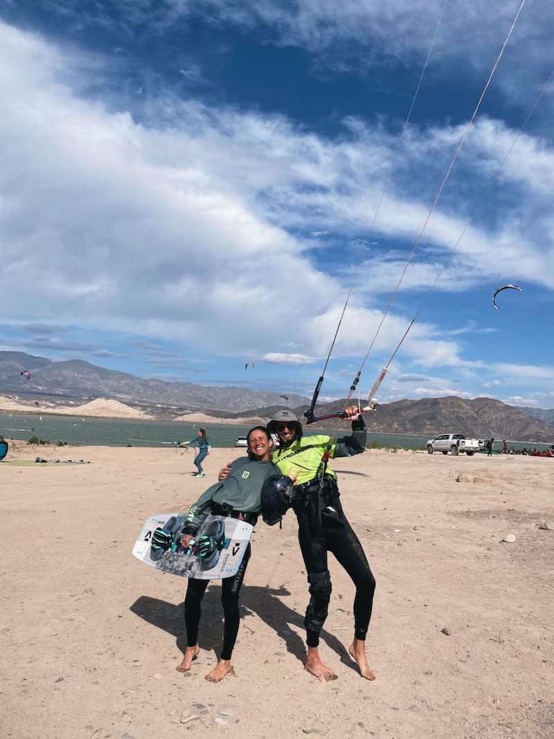 El movimiento del kite algo familiar me resultaba. De chica, cuando me iba de vacaciones con papá a Miramar, llevábamos un cometa y era el plan de la tarde volarlo en la playa. El funcionamiento es más o menos el mismo, así que no costó tanto agarrarle la mano. Con eso apenas dominado, Mati me agarró atrás del arnés y me dijo: "ahora vamos a cruzar el dique haciendo Body Drag, y nos vas a llevar vos" (una técnica para andar más bien acostada, con la tabla bajo el brazo y arrastrada por la fuerza del kite). Los instantes de adrenalina iniciales se combinaron con un tremendo asombro: el ser arrastrada, sobre el agua, con esa vista, el brillo turquesa, la cordillera nevada... lo pienso y todavía me emociona.
