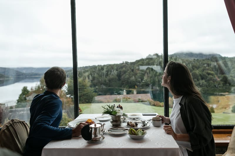 El famoso desayuno buffet, insignia del hotel patagónico, al principio se ofreció a la carta, pero semanas después se acondicionó el salón con mamparas y más personal para que se sirva en modo asistido: siguen estando todas las ricas y variadas propuestas tradicionales (pastelería y panadería artesanal, waffles, mermeladas y dulces caseros, huevos, fiambres, cereales, jugos y más) con la diferencia de que ahora uno se acerca a la estación que quiere y le pide al mozo lo que desee comer, para evitar así que distintas personas manipulen los utensilios.