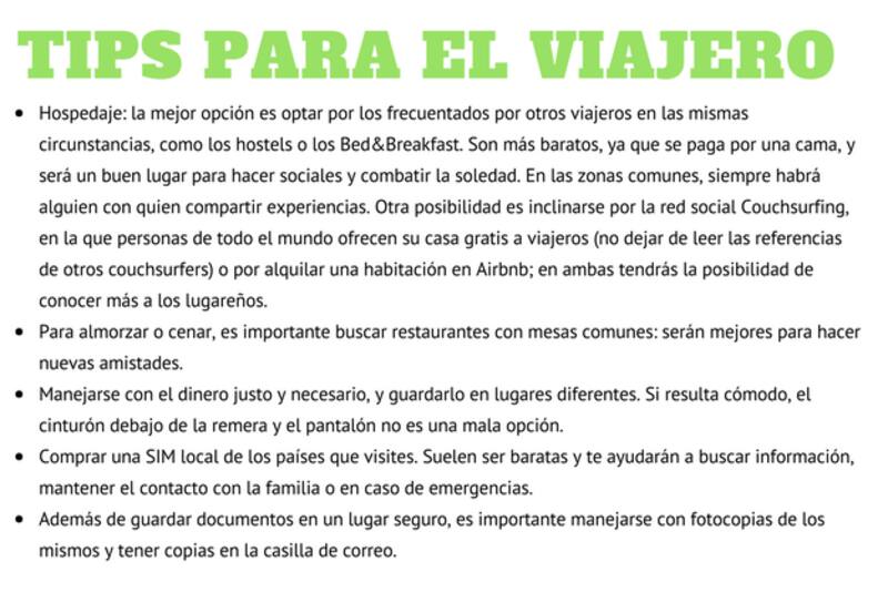 Se suma también la posibilidad de sufrir algún contratiempo, como robos, enfermarse, perder algún tren o avión. Y que los costos aumentan considerablemente. Todo es más caro: las habitaciones de los hoteles, el alquiler de los autos, las comidas; y se pierde cualquier posibilidad de conseguir alguna promoción en excursiones o entradas a eventos. Además, tener que hacerse cargo de toda la organización, si bien permite una flexibilidad absoluta, cansa. Si la idea no es improvisar, habrá que estar atentos a mapas, hoteles y sus reservas, horarios, transportes, sitios a visitar, entre otras circunstancias.