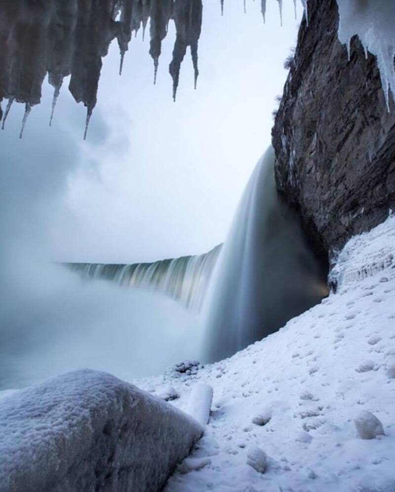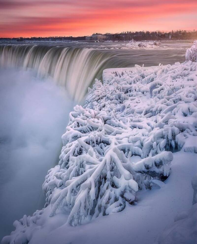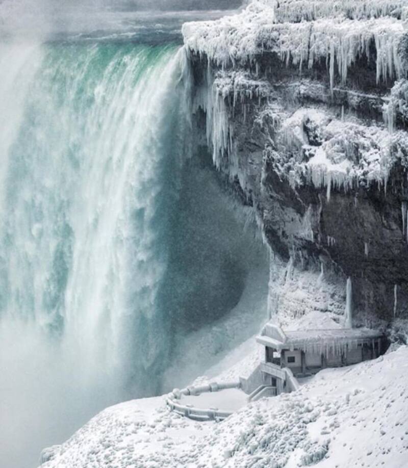 La imagen parece sacada la película 'Frozen' y o de la apocalíptica 'El día después de mañana', pero no. Aunque el agua todavía cae en las cataratas, esta fluye a través de gigantescos bloques de hielo. Una ola de frío que arrasa la costa oeste de América del Norte - fruto de la denominada tormenta Harper- generó bajas temperaturas de hasta los 20 grados bajo cero y provocó un fenómeno poco visto: se congelaron las Cataratas del Niágara.
