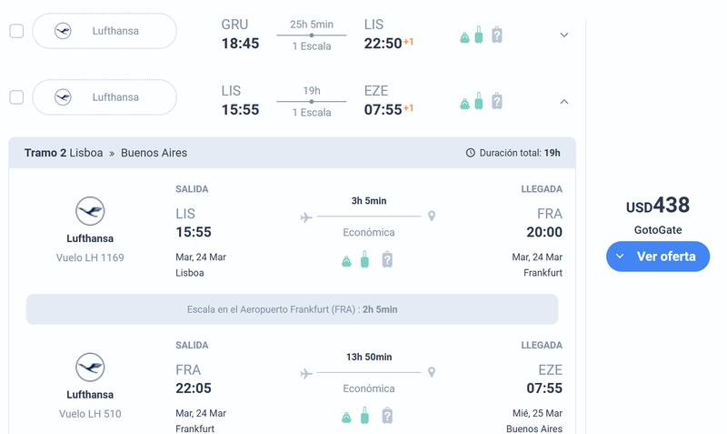 La opción más destacada es un itinerario con Lufthansa, que parte de San Pablo (GRU) a Lisboa (LIS) el 14 de noviembre de 2025 y regresa el 24 de marzo de 2026 hacia Buenos Aires (Ezeiza) a un precio final: u$s 439.