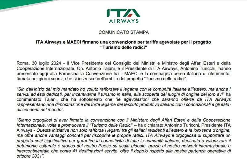 En el marco del programa "Turismo delle radici", ITA Airways y el Ministerio de Asuntos Exteriores y Cooperación Internacional de Italia sellaron un acuerdo que ofrece descuentosen pasajes de avión para italianos y sus descendientes alrededor del mundo.