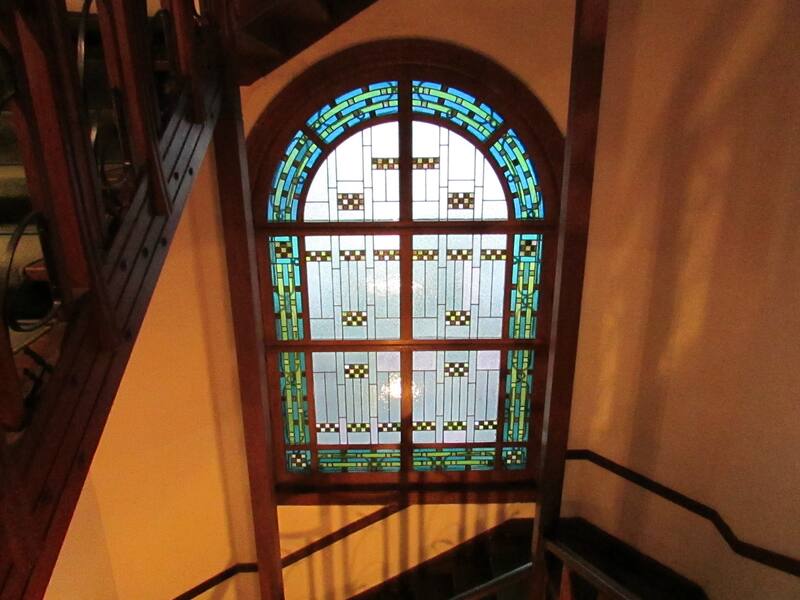 El mobiliario de roble y la carpintería, los vitrales, las luminarias y las cerámicas fueron diseñados por el arquitecto Gustave Serruriery y realizados en Lieja (Bélgica).