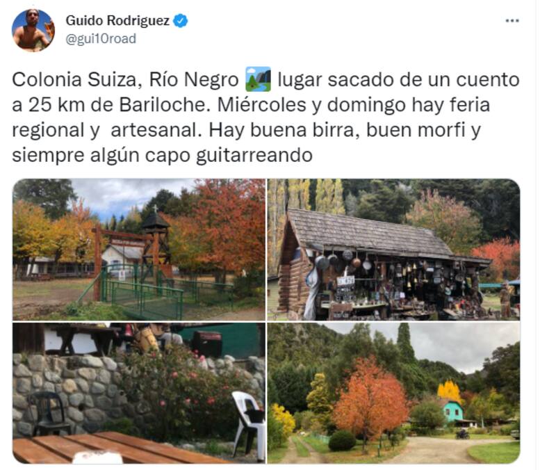 "Colonia Suiza, Río Negro. Lugar sacado de un cuento a 25 km de Bariloche. Miércoles y domingo hay feria regional y artesanal. Hay buena birra, buen morfi y siempre algún capo guitarreando", destacó @gui10road, un usuario de Twitter que comparte diarios de viajes y destinos pocos conocidos.
