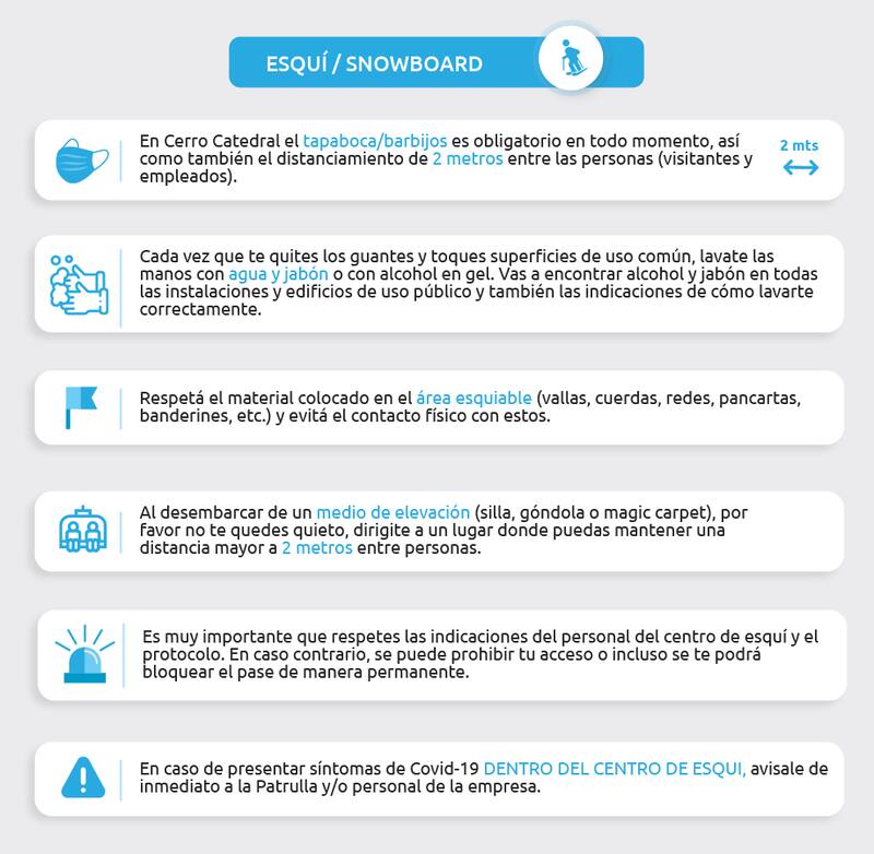Según un comunicado oficial del Ente Autárquico Municipal del Cerro Catedral (EAMCEC), habrá estudiantes instructores, que actuarán como preventores en lugares estratégicos del cerro, para ayudar con el cumplimiento de los protocolos sanitarios y todas las medidas de seguridad. La idea es avanzar en una apertura paulatina, aunque esto dependerá de lo que autoricen la provincia y la Nación con respecto al turismo.