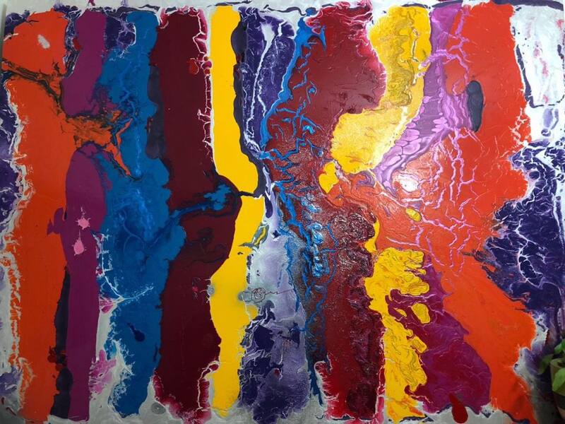 “En lo único que pienso es en los colores, el resto va saliendo , explica a Clase Ejecutiva frente a sus telas de gran tamaño de las cuales emergen las texturas cuando se secan los materiales y los efectos químicos aportan lo suyo. Puede ser un trazo ancho con pincel o un detalle agregado con fibra, todo vale en la improvisación armónica de Larco.