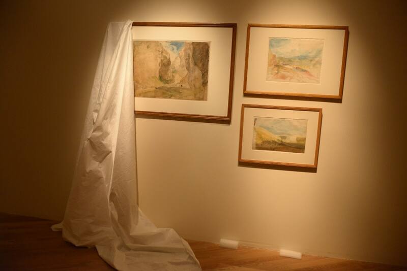 Algunas de las piezas están cubiertas con delgadas telas blancas para protegerlas hasta el día de la inauguración. Por convención, todas las obras realizadas en papel, como el caso de las acuarelas, solo pueden exponerse a una intensidad de luz máxima de 50 lx.