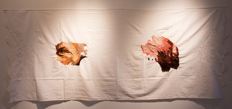 En la serie “La piel de mis abuelos se exhibe el trabajo final de un proceso que inició con una fotografía de los abuelos de la artista y continuó con la traducción de las líneas de expresión de sus rostros en abstracciones bordadas a mano. Elige plasmarlas sobre una funda de almohada antigua, blanca, con sus extremos calados, como la que se encuentra en la casa de cualquier abuelo.
