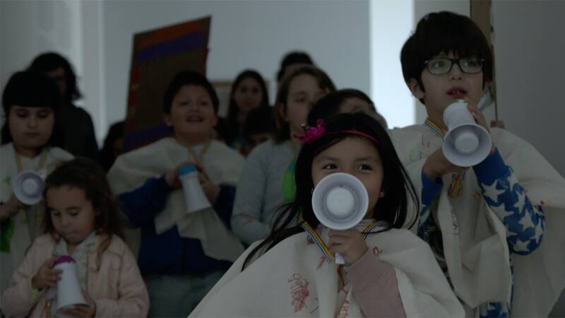 La exhibición se articula alrededor del filme 'La plaza del chafleo', donde se narran situaciones como el resultado de un taller de protesta realizado con niños a mediados de año en el Malba.