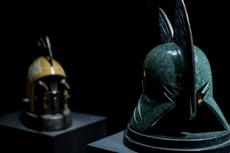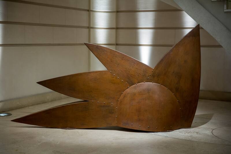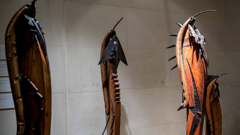 Un casco abre la exhibición curada por Roberto García. Esa escultura que camufla como madera el hierro se asemeja a su vez a los restos del casco de un barco encallado. A partir de allí el recorrido nos depara figuras de guerreros, tótems, pequeños barcos y más cascos; una fantasía onírica de formas y texturas.