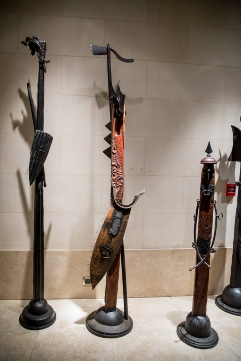 En el Palacio Duhau se pueden ver un puñado de las 40 originales. Cada una es diferente a la otra. El artista las personaliza desde las formas que les imprime hasta los objetos que portan. Puede ser una guadaña, una llave, un pedazo de metal con forma de arma, lo que haya encontrado y atesorado en su taller cordobés a la espera de formar parte de una obra.
