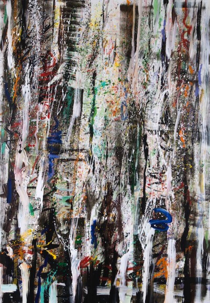 Ese “caos ordenado se crea a base de planificar capas, explorar el uso del pincel a través de diverso arrastres, salpicados y splashings que dotan al cuadro de dinamismo. La experiencia y la docencia le permiten trabajar con las capas aun frescas y concluir el trabajo en menos de una hora.