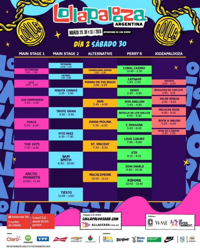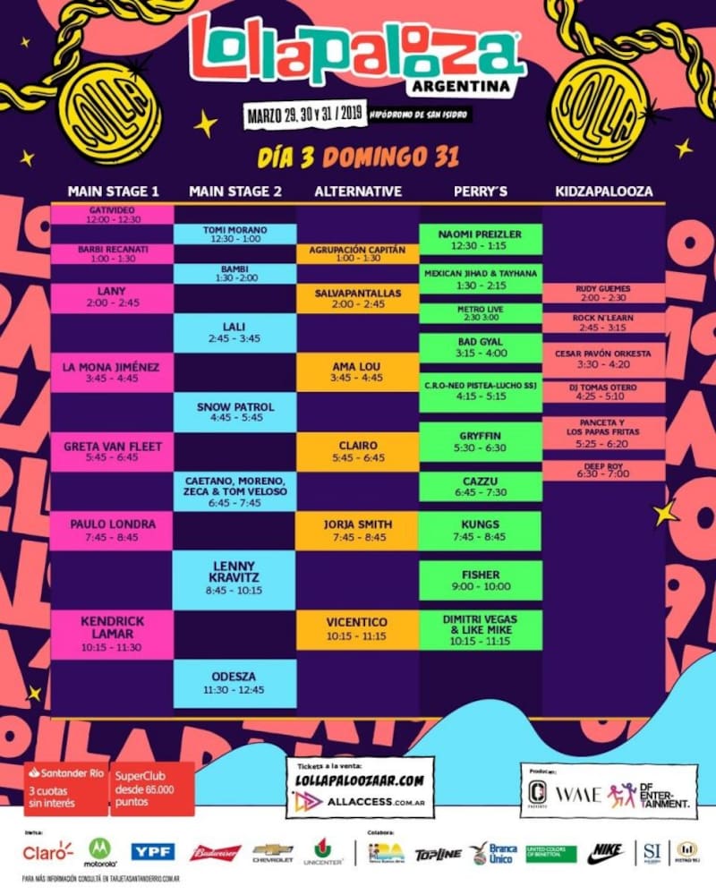 El megafestival se realizará los días 29, 30 y 31 de marzo en el Hipódromo de San Isidro. El viernes 29 tendrá un Main Stage 1 de lujo que contará con los shows de Twenty One Pilots, Interpol, Bring Me The Horizon, Kamasi Washington y Escalandrum, mientras que artistas como Steve Aoki, Post Malone, Jorge Drexler y Portugal The Man, Rosalía y Years & Yearsserán serán recibidos por el público argentino en el Main Stage 2 y el escenario Alternative.