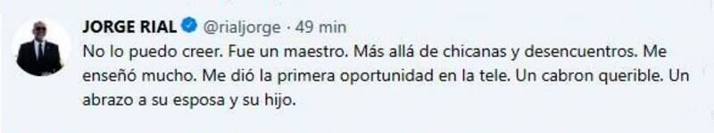 Precisamente, Jorge Rial fue uno de los primeros en expresar sus condolencias. "No lo puedo creer. Fue un maestro. Más allá de chicanas y desencuentros. Me enseñó mucho. Me dio la primera oportunidad en la tele. Un cabrón querible", recordó el conductor de Intrusos a quien fuera creador de ciclos de chimentos inolvidables, como Indiscreciones y Convicciones.