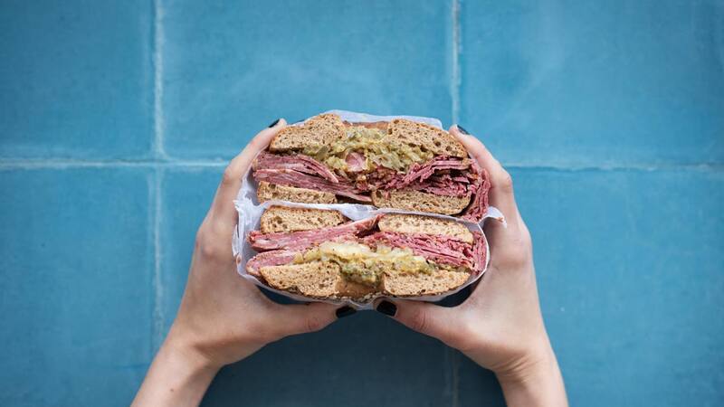 • Bagel de pastrón (mostaza relish, chukrut, pastrón, en bagel integral).