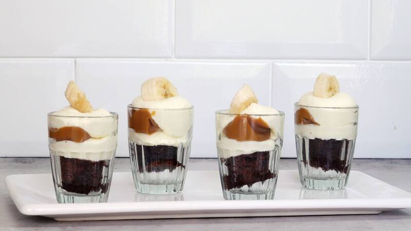 Colocar en el fondo de las copas una bese de bizcochuelo, unas cucharadas de dulce de leche, unas rodajas de banana, otro poco de bizcochuelo y crema chantilly. Decorar con salsa de chocolate y rodajas de banana.