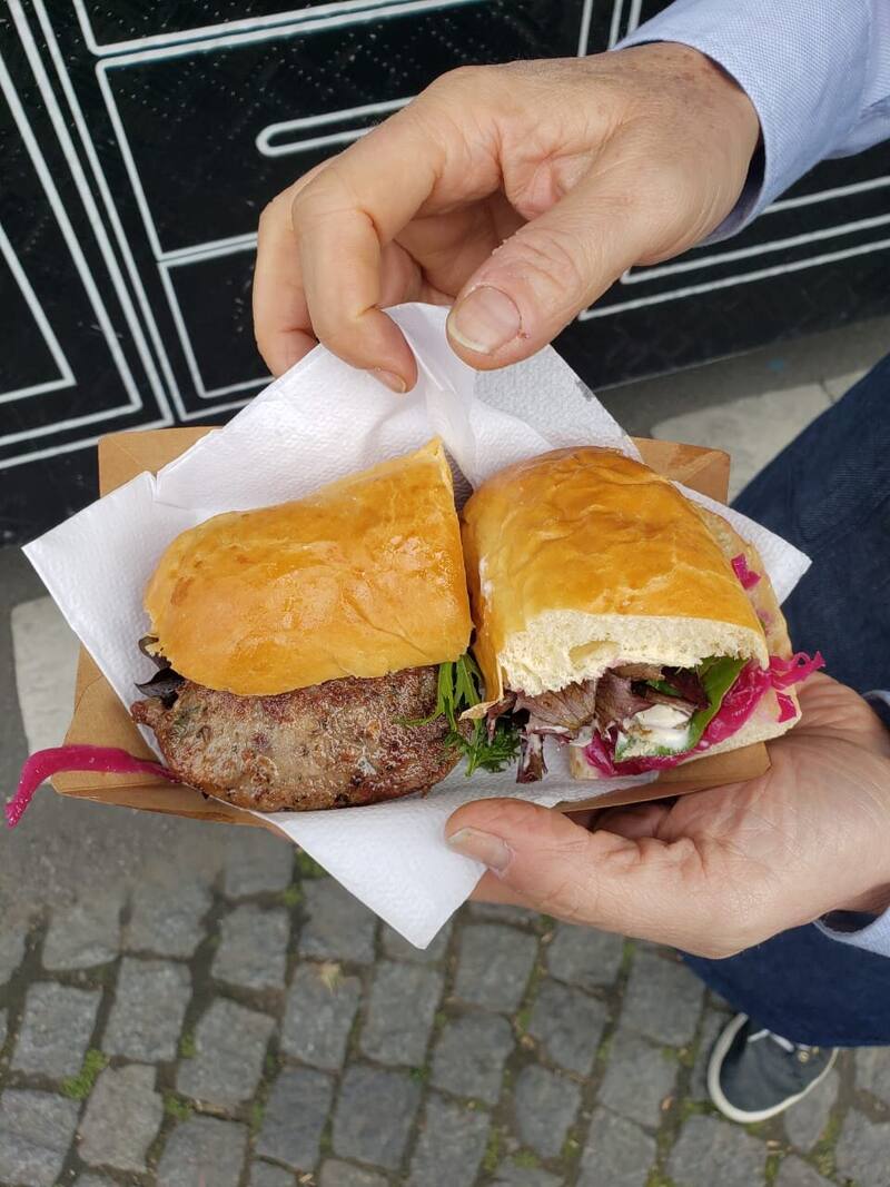 Sándwich de ojo de bife con juliana de criolla y curry $200