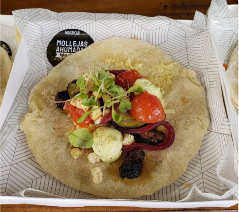 Mollejas ahumadas, lefse de papa, alioli cítrico y queso fontina
