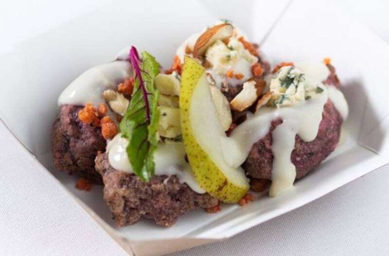 Malfatti de remolacha, con bechamel de queso azul, almendras y peras