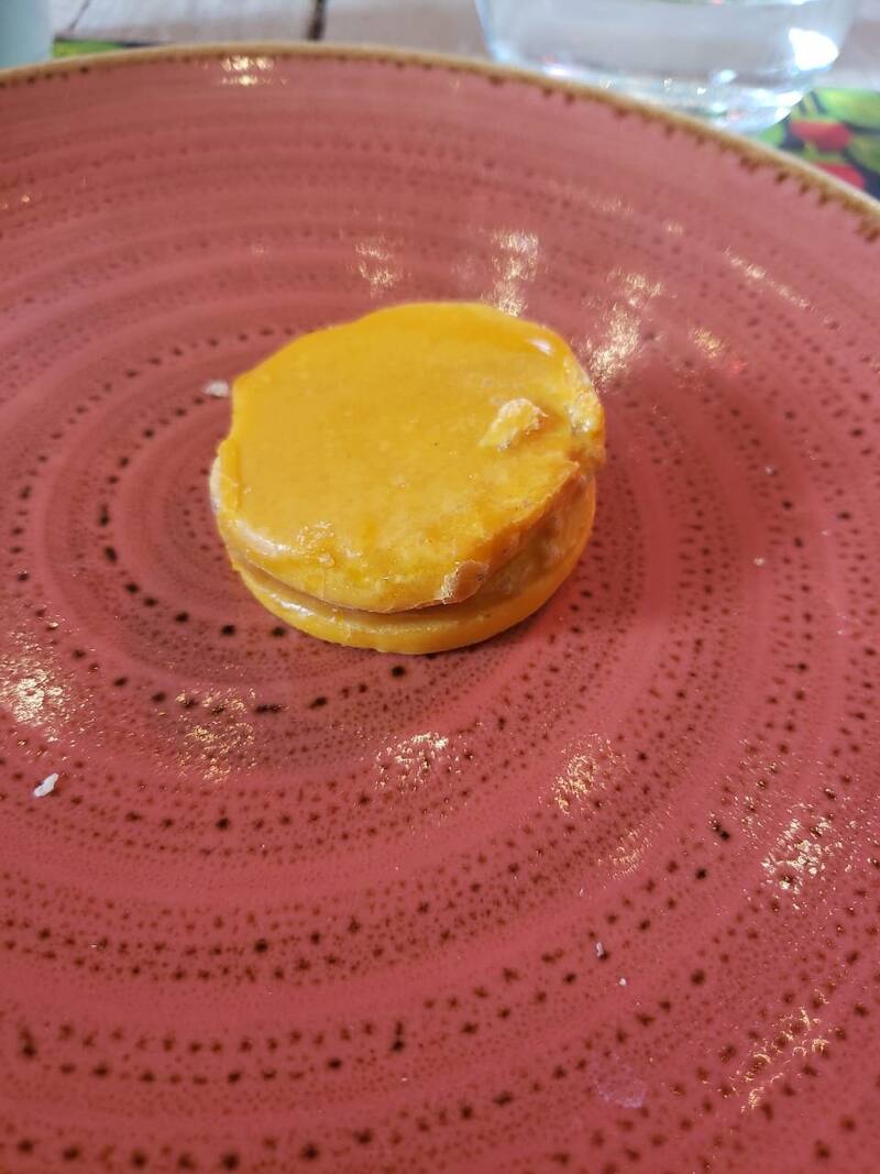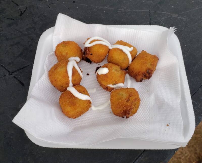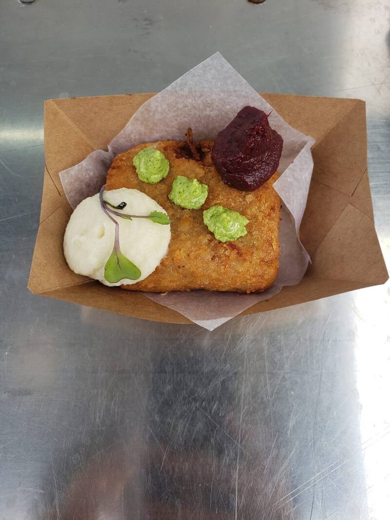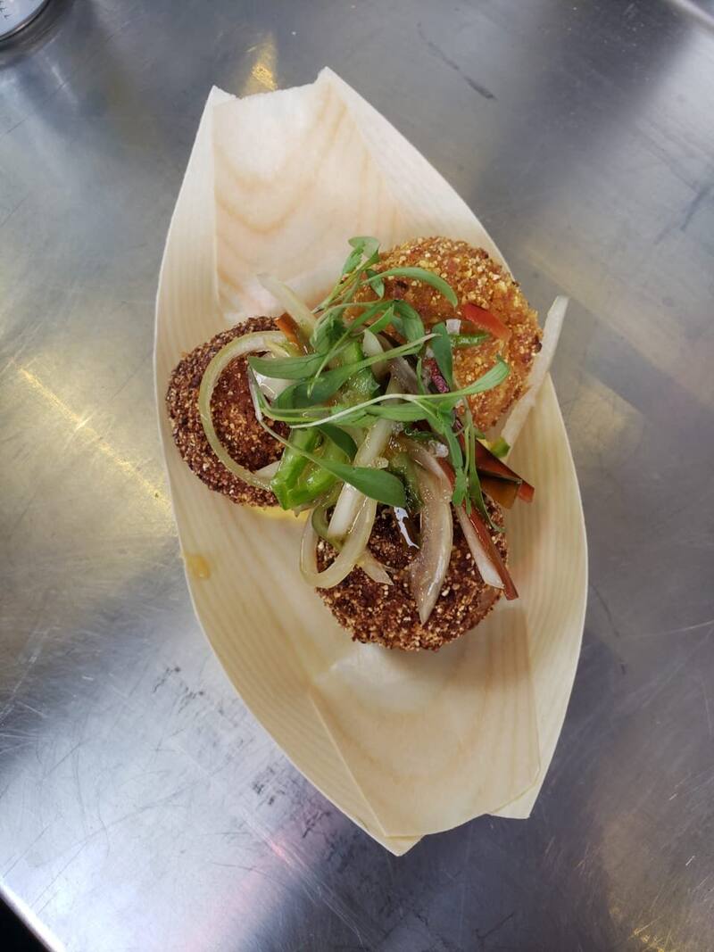 Croquetas de pacú y mandioca, crema de maíz, criolla de tuna fresca $100 (invitado)