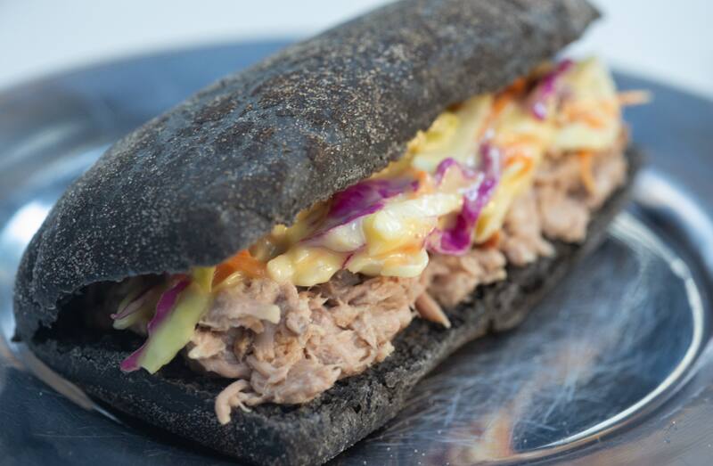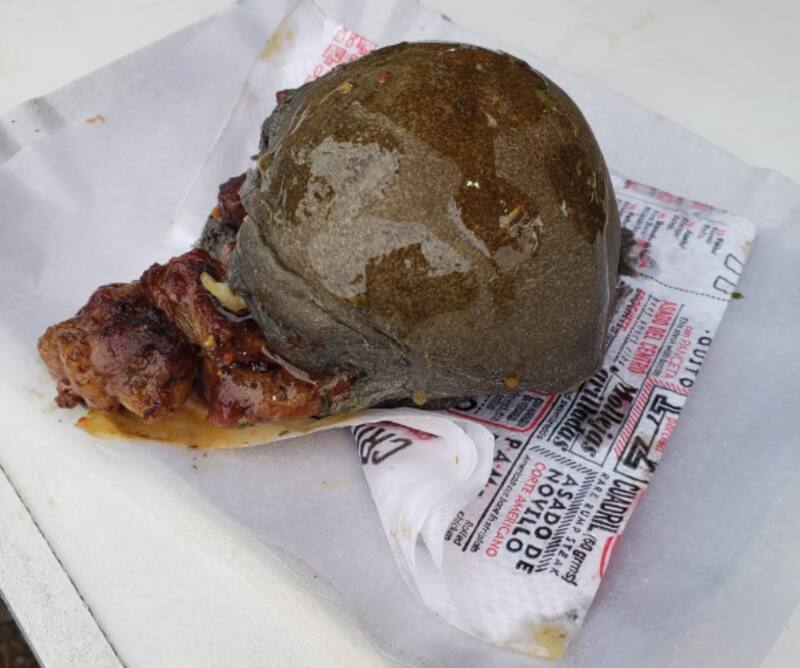 Chori-pancho: salchicha parrillera con relleno de morrones asados, mayonesa de chimi, mostaza con miel y salsa de jalapeños en pan de tinta de calamar $150