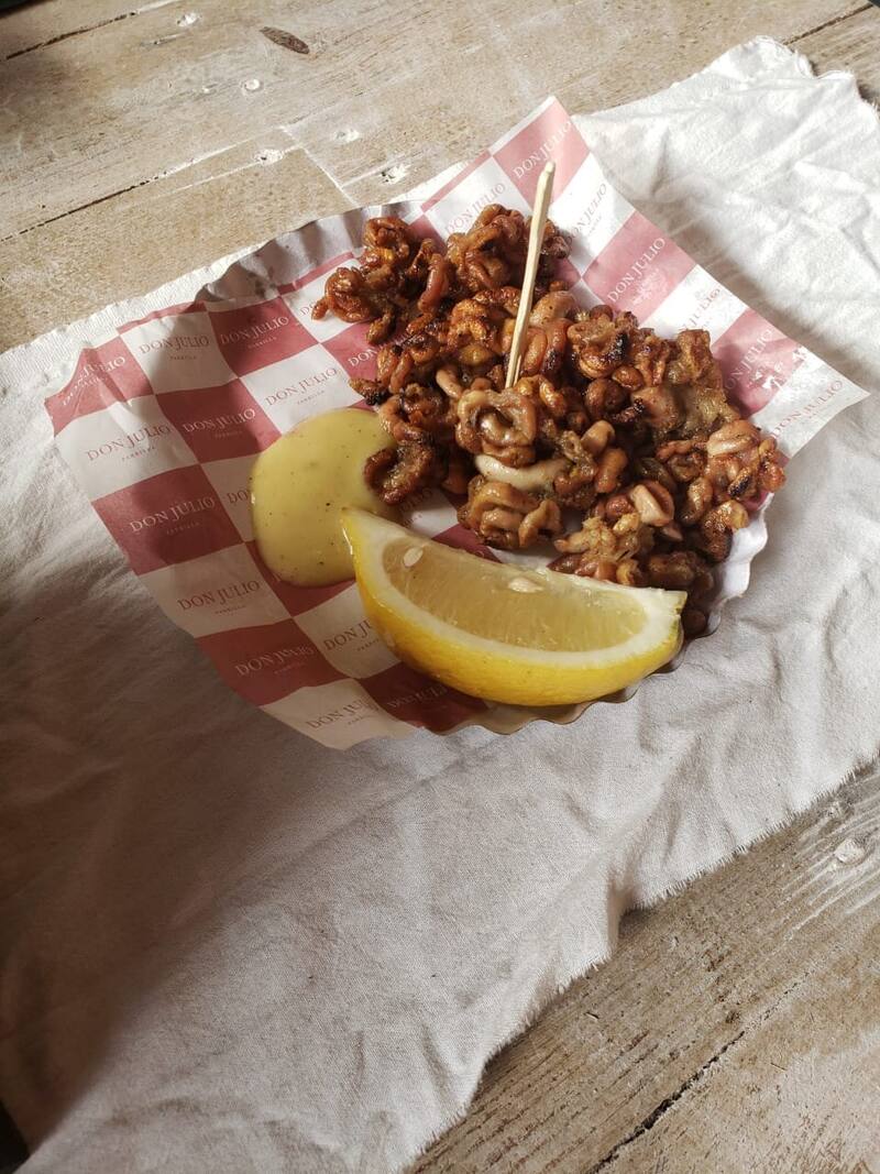 Mollejas ahumadas, lefse de papa, alioli cítrico y queso fontina $200
