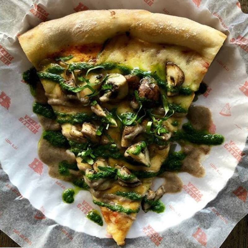 Pizza de mozzarella con portobellos, pesto de espinaca, hongos secos y brotes $110