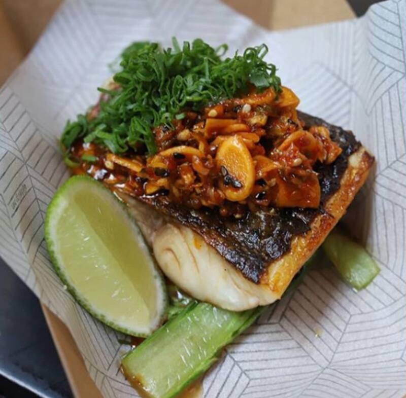 Shiromi a la brasa: pescado marinado en salsa de soja con salsa de almendras y ajos crocantes $200"