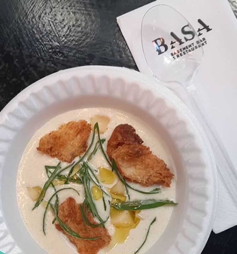 Sopa de papa y puerro, cuartirolo, pasas rubias y croutons de brioche $150