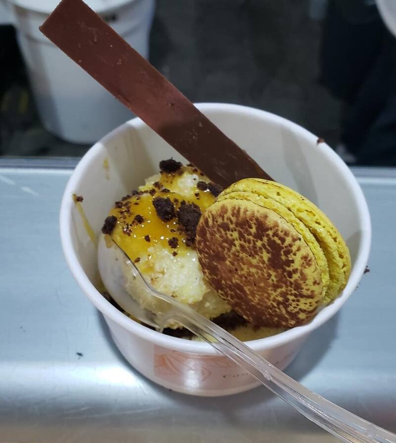 Helado frito en crust de coco + mango + café + maracuyá $180