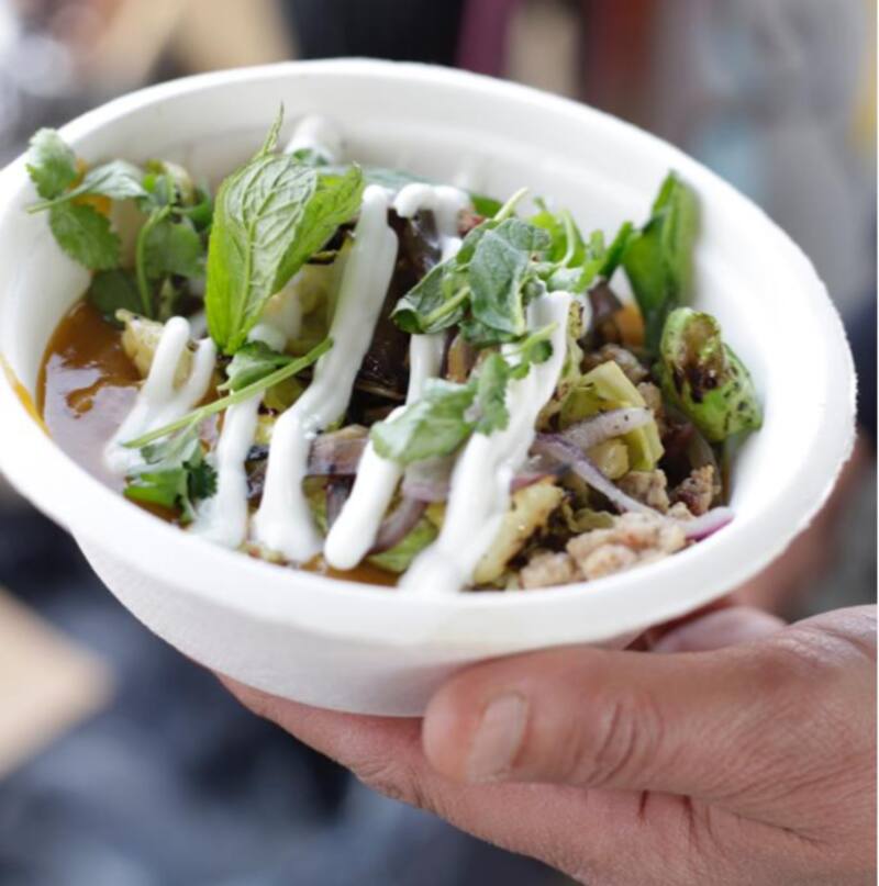 NEM SÁI GÓN: roll frito de papel de arroz, relleno de cerdo, hongos shitake, fideos celofán y vegetales. Acompañado de lechuga, menta, albahaca y cilantro $100