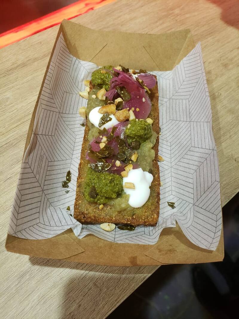 Tostón de masa madre, terrina de morcilla, frutos secos neuquinos y pera del Valle $100
