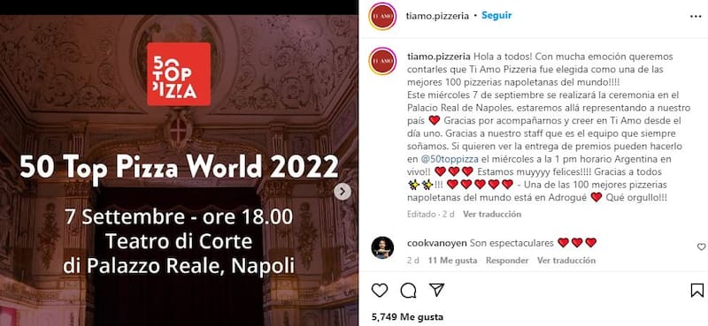 "Con mucha emoción queremos contarles que ‘Ti Amo' fue elegida como una de las mejores 100 pizzerías del mundo. Este miércoles 7 de septiembre se realizará la ceremonia en el Palacio Real de Nápoles, por lo que estaremos allá representando a nuestro país", anunciaron desde el comercio a través de sus redes sociales.