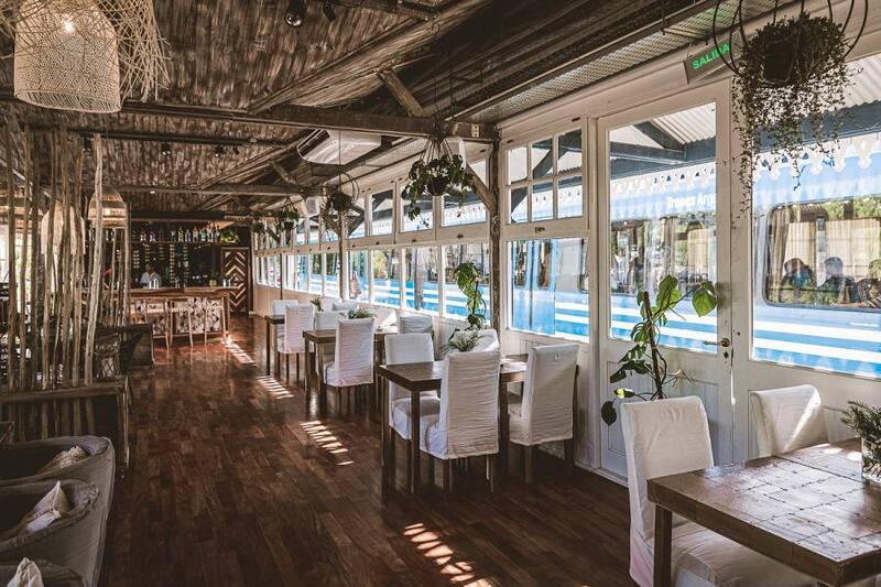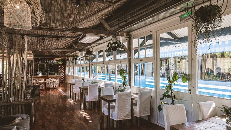 De pisos desmantelados y techos de tela pasaron a un gran deck de madera, un horno de barro, camastros, una barra completamente renovada y una decoración con madera, mimbre y naturaleza que te hace sentir en Bali o en Ibiza. A eso se le suma un plus muy pintoresco: la visita del tren a través de la ventana. Ahí ya tenés su diferencial.