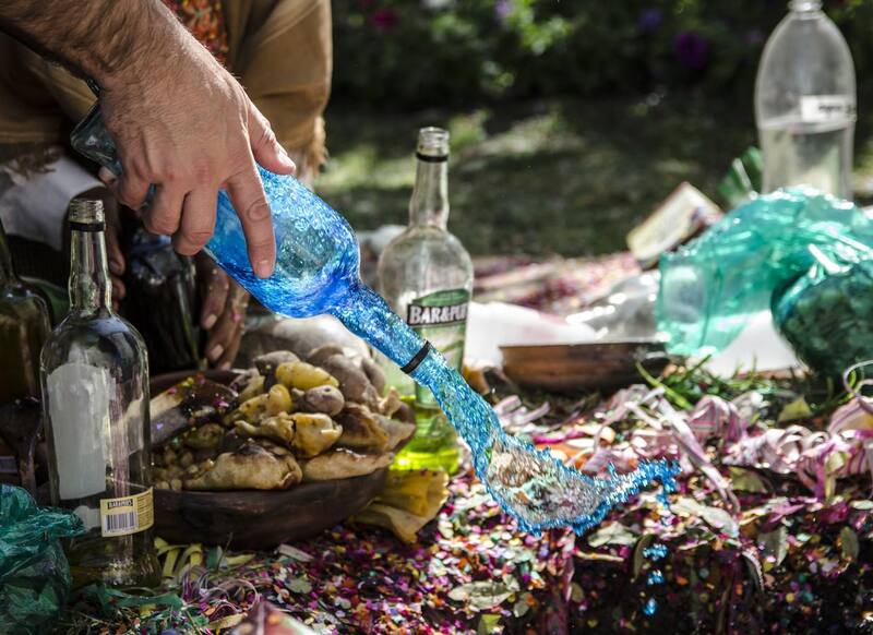 - Colocar ahí una ollita o cuenco de barro con papa, choclo y/o maíz, más hojas de coca (también puede ser romero o ruda), un chorrito de caña (u otro aguardiente) y algún cigarrillo o sahumerio prendido (para espantar a los malos espíritus)