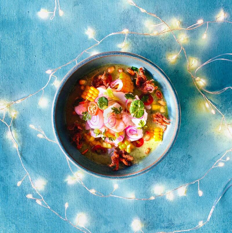 - Luego, disponer el pescado y las gambas dentro de la leche de tigre, dejar reposar y servir en un plato junto con las cebollas, el cilantro, el choclo en granos y el jalapeño.