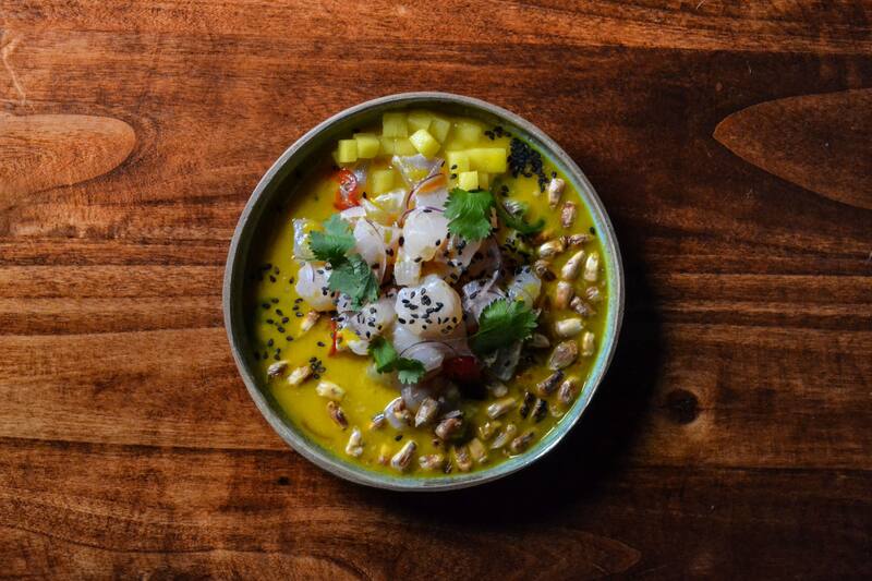 - En un bowl, mezclar 120g de pesca cortada con 60ml de leche de tigre y dejar marinar por 5 min. Luego servir por un costado el maíz chuspillo tostado, al otro extremo unos trozos pequeños de mango, al centro cuatro rodajas finas de jalapeño y terminar con cebolla en julianas y cilantro fresco.