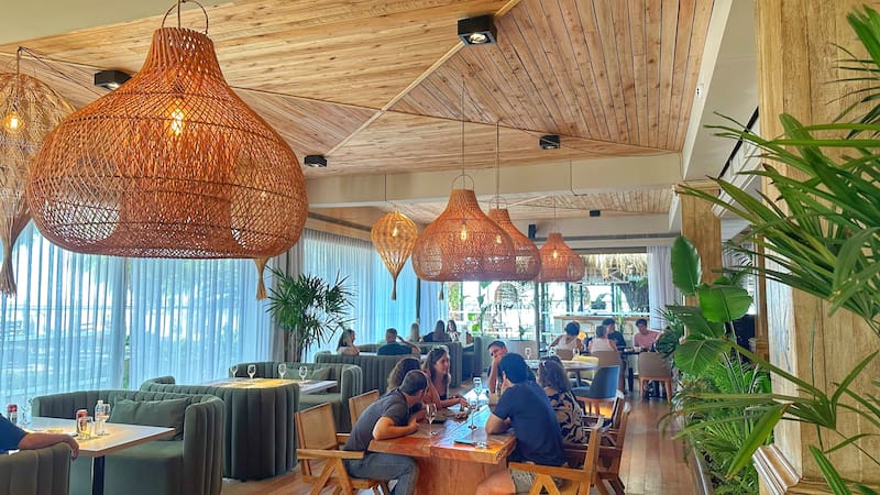 El salón principal es un espacio amplio y acogedor, caracterizado por una delicada decoración con techos revestidos completamente en madera y mimbre, rodeado de vegetación, grandes maceteros, plantas que cuelgan desde el cieloraso y grandes ventanales que permiten la entrada de luz natural ofreciendo hermosas vistas al Río de La Plata.