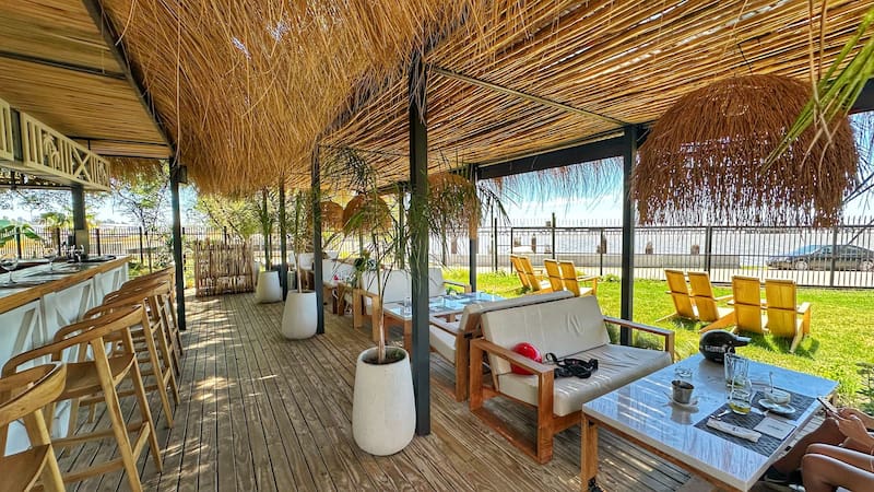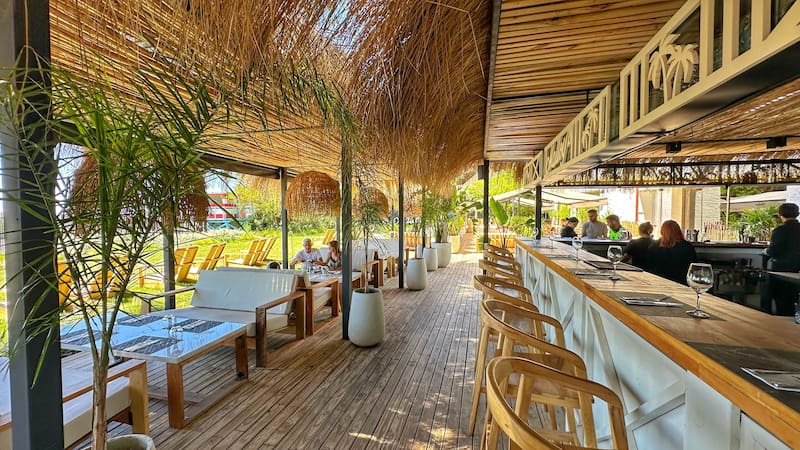 En el exterior, el restaurante ofrece una experiencia al aire libre inigualable en su amplio deck, con una barra donde preparan riquísimos tragos de autor. Cuenta con diversos sectores como pérgolas de madera con cómodos sillones para grupos de amigos y también mesas individuales.