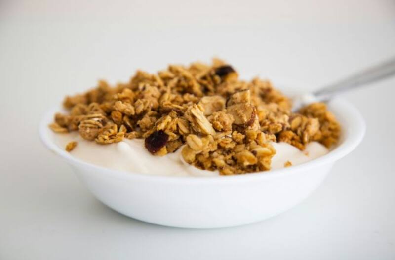 - Una taza de yogur griego sin azúcar, cubierto con nueces, semillas de chía y bayas frescas.