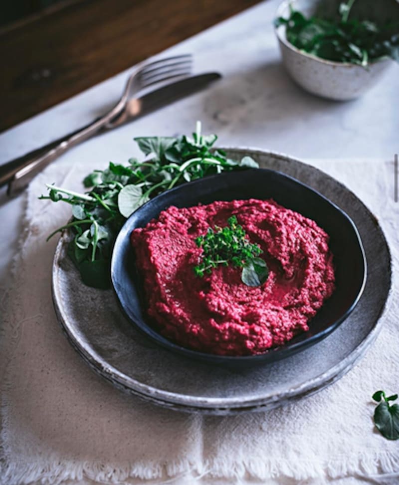 Lavar las remolachas y cocinarlas en una olla con abundante agua hirviendo. Pelarlas y cortarlas en cubitos. Colocar los cubos de remolacha en un bowl, añadir la mayonesa, el queso crema y un chorrito de jugo de limón. Procesar con ayuda de una procesadora hasta lograr una mezcla de textura suave y homogénea. Condimentar con sal y 1cda de aceite de oliva. Decorar con semillas de sésamo tostado. Conviene dejar enfriar la mezcla en heladera durante una hora previo a servir.