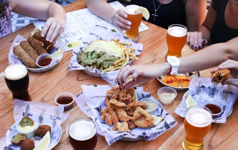 Para acompañar hay tapeo caliente para compartir: empanadas de pollo al curry, buñuelos de acelga, croquetas de jamón y queso, tortilla española, así como también las hamburguesas, sándwiches.