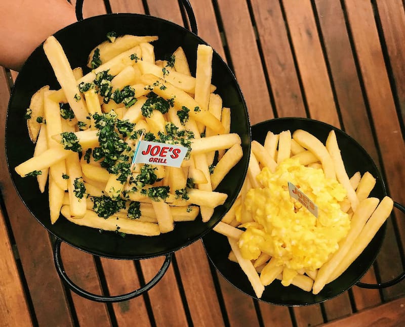 - Papas Joe's con cheddar fundido, bacon y ciboulette