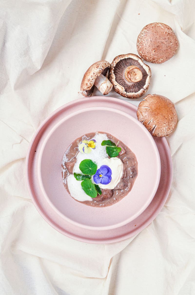En una olla calentar el aceite y colocar la cebolla cortada en cubos y el ajo picado. Sofreír. Agregar los hongos portobello cortados en cuartos y saltear unos minutos. Agregar el vino para desglasar y dejar reducir unos minutos. Colocar la leche de avena e ir removiendo. Una vez que hierve, salpimentar y servir.
