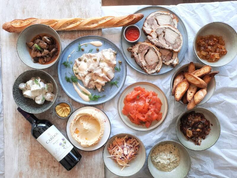 El restaurante Jornal de Saavedra propone una abundante Caja Navideña con la que comen cuatro personas y pican seis, cargada de delicias artesanales típicas empacadas al vacío más una botella de vino. El box navideño incluye: Porchetta (400 gr), Vitel toné (200 gr), Trucha ahumada gravlax (200 gr), Hummus (200 gr), Escabeche de hongos (200 gr), Chutney de manzana (200 gr), Ensalada Alemana (200 gr), Babaganush (200 gr), Ensalada Coleslow (200 gr), Caponata Siciliana (200 gr), Tostada de masa madre (200 gr), Dressing mostaza, alcaparras y sriracha casera y una botella de Vino Los Cardos Malbec por $5099 y $4799 con descuento en efectivo.