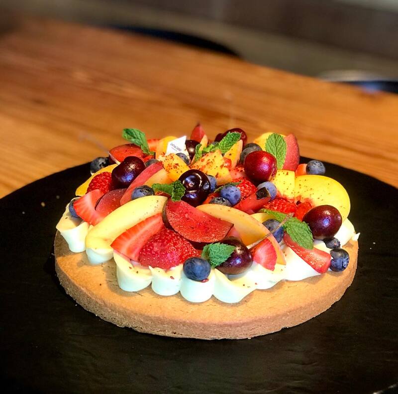- Tartelette de fruta, con masa sucrée, crema de almendras, jalea de frutillas, crema pastelera de vainilla y frutas frescas ($1300 en formato de torta redonda).