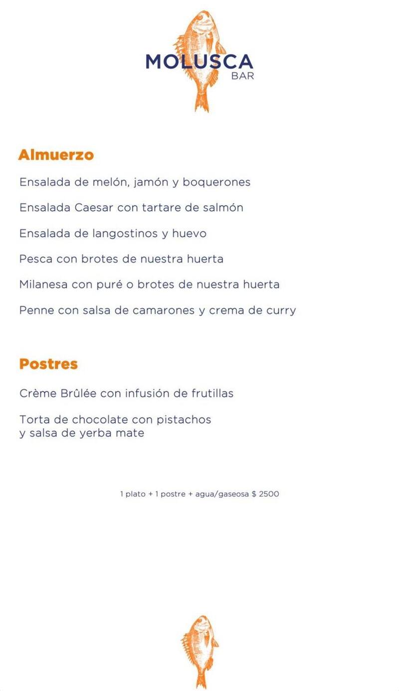 El plato de comida en Molusca se encuentra en un promedio de entre $ 3500 y $ 4000 por persona, aunque también, para el almuerzo, existen promociones de un plato a elección más un postre y una bebida a $ 2500.