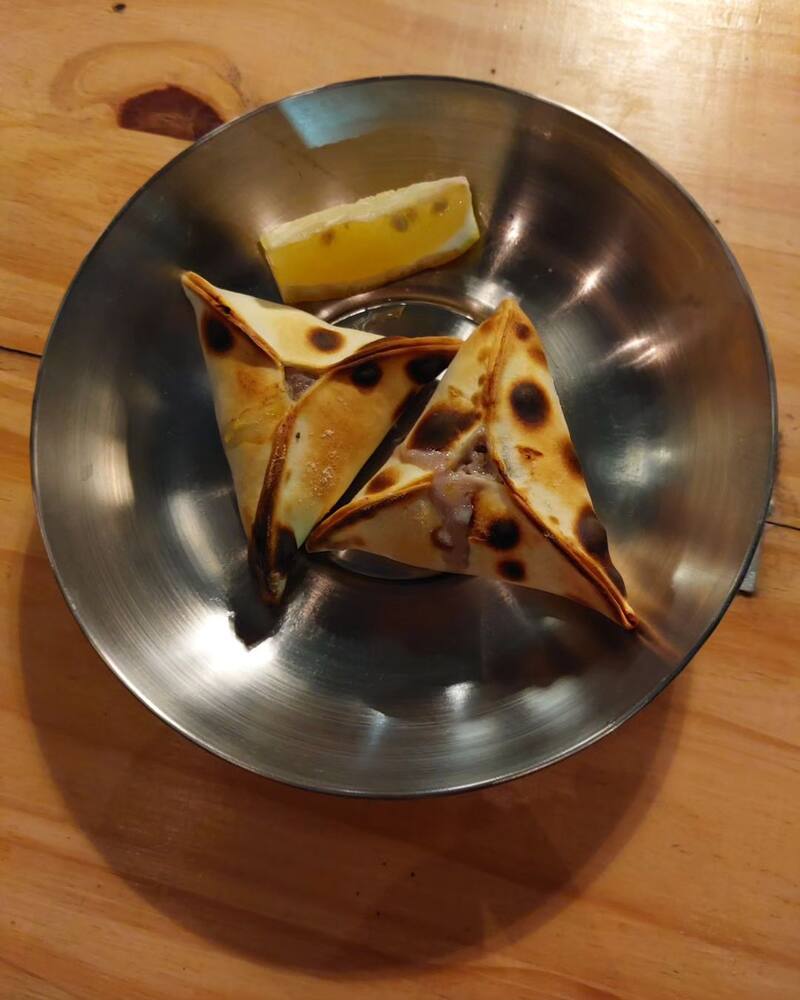 El menú incluye opciones distintivas como la empanada "de la casa", presentada en forma triangular y con un relleno de carne molida, especias y maní, que al acompañarse con limón ofrece un toque original.