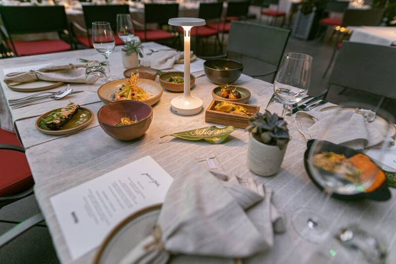 Una vez ubicados en nuestros asientos, las pequeñas hojas de árbol que decoraban el mantel nos presentaban, con letras en dorado, la experiencia de la noche: "Julio en Gioia". El chef Julio Martín Báez fue convocado para crear un menú único especialmente para el evento gastronómico. "La experiencia propone invitar a cocineros que normalmente no se dedican exclusivamente a la cocina vegana para animarlos a hacer algo distinto", nos contó Eugenia Motter gerente de marketing del Palacio Duhau.