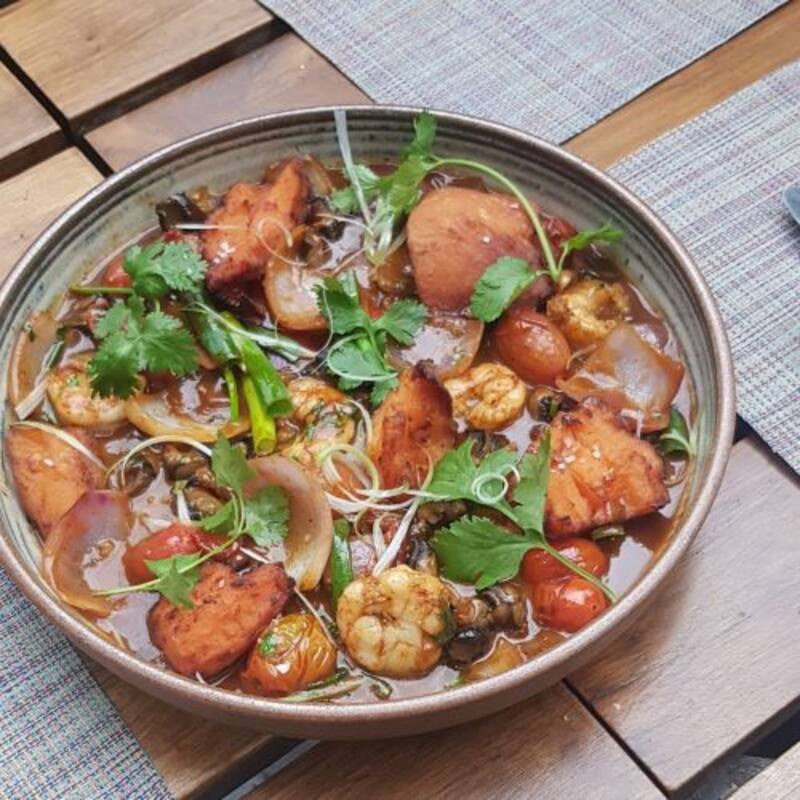 Salteado de caracoles y langostinos con salsa de lomo,